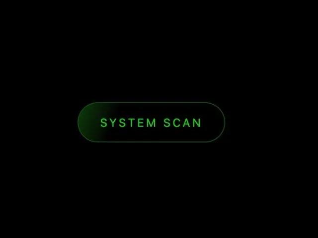 Кнопка 'SYSTEM SCAN' с анимированной линией сканирования. Идеальна для дашбордов, утилит и инструментов безопасности.
