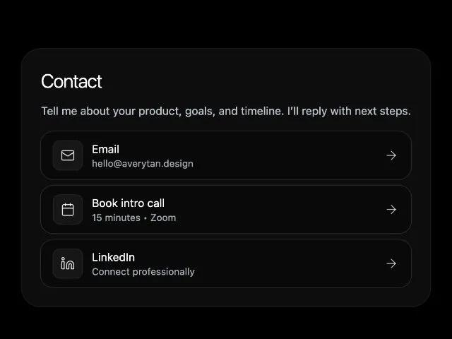 <a href="mailto:hello@averytan.design" class="flex items-center justify-between rounded-2xl bg-black/30 px-4 py-3 ring-1 ring-white/10 hover:bg-black/40 transition">