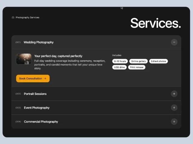 Адаптивный Tailwind Accordion для услуг фотографа. Список с иконками, изображениями и CTA для бронирования. Идеально для портфолио.