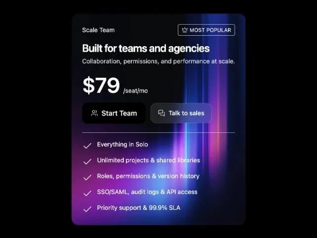 Карточка с ценой командного тарифа для SaaS. Tailwind CSS, кнопки CTA, список фич. Адаптивный дизайн.
