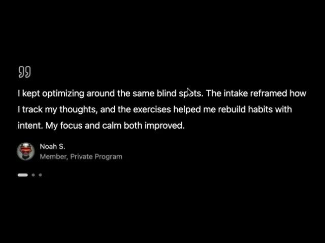I kept optimizing around the same blind spots. The intake reframed how I track my thoughts, and the exercises helped me rebuild habits with intent. My focus and calm both improved.