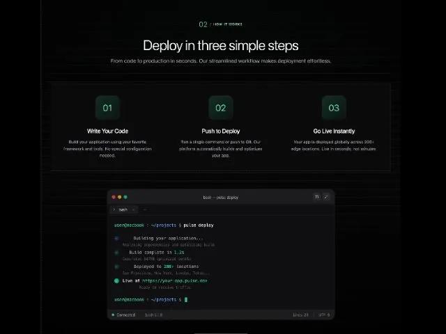 Секция "Как это работает" с 3 шагами, демо терминала и CTA. Идеально для лендингов SaaS и dev-tools.