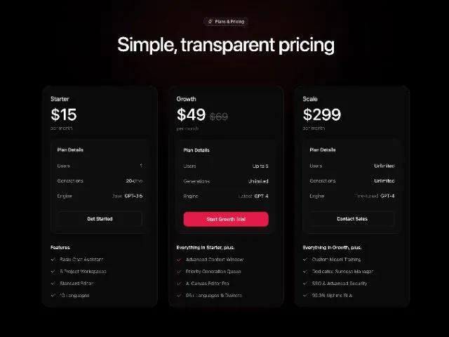 Секция с трехуровневой ценовой политикой для SaaS. Включает 3 тарифа (Starter, Growth, Scale) с деталями, списком функций и кнопками CTA. Адаптивный дизайн.