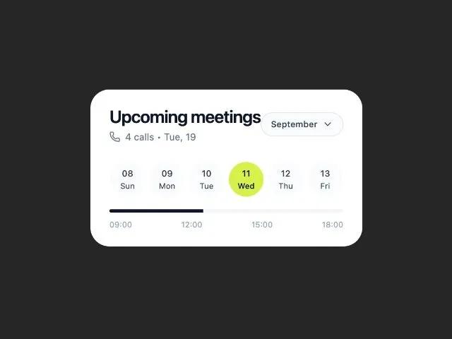 Карточка календаря предстоящих встреч: отображает события, выбор месяца, дней и прогресс-бар. UI-компонент для дашбордов и планировщиков.