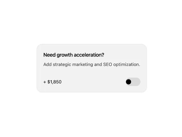 Карточка с переключателем для доп. опций. Показывает название, цену и кнопку вкл/выкл. Идеально для чекаута, цен и конфигураторов.