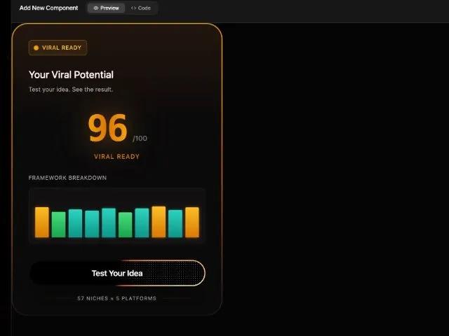 Карточка "Hero" с анимированным счетчиком виральности, визуализацией "эквалайзера" и кнопкой CTA. Для дашбордов и аналитики.