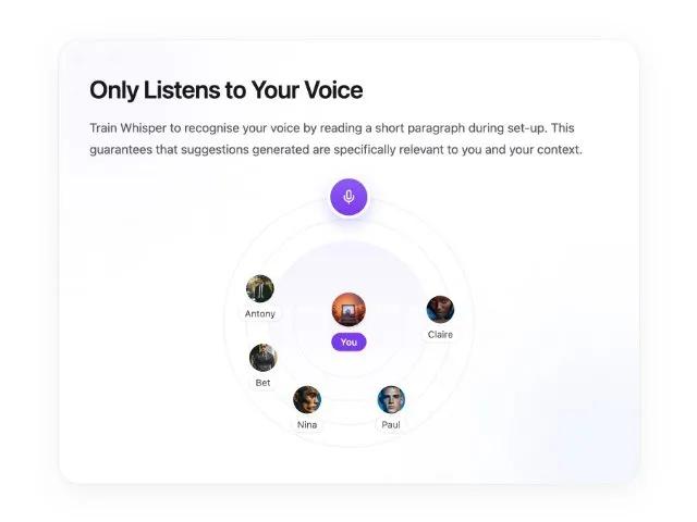 Train Whisper to recognise your voice by reading a short paragraph during set‑up. This guarantees that suggestions generated are specifically relevant to you and your context.